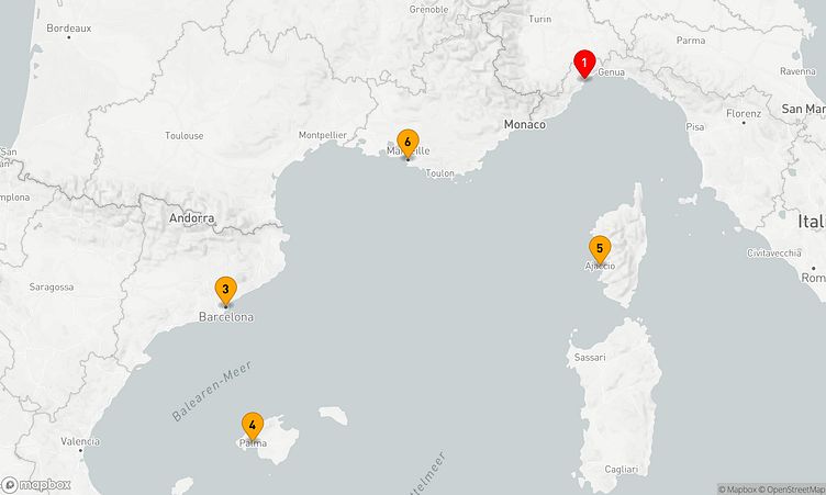 Diese Kreuzfahrt führt Sie zu den beeindruckenden Häfen von Savona, Barcelona und Ajaccio (Korsika), die mit einzigartigen Sehenswürdigkeiten und lebendigen Eindrücken auf Sie warten.