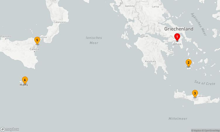 Während Ihrer Kreuzfahrt besuchen Sie unter anderem die Häfen von Athen (Piräus), Milos und Giardini-Naxos, wo spannende Einblicke in Land und Kultur auf Sie warten.