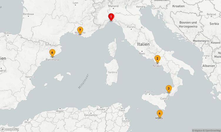 Ihre Route führt Sie unter anderem zu den faszinierenden Häfen von Genua, Neapel und Valletta, wo Sie die Atmosphäre und das Leben vor Ort spüren können.