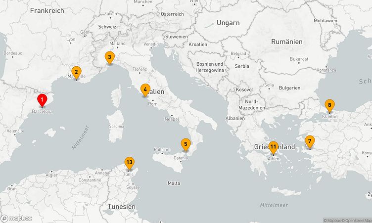 Bei den Häfen wie Barcelona, Savona und Izmir haben Sie die Gelegenheit, die Region auf eine besondere Art zu erkunden und neue Eindrücke zu sammeln.