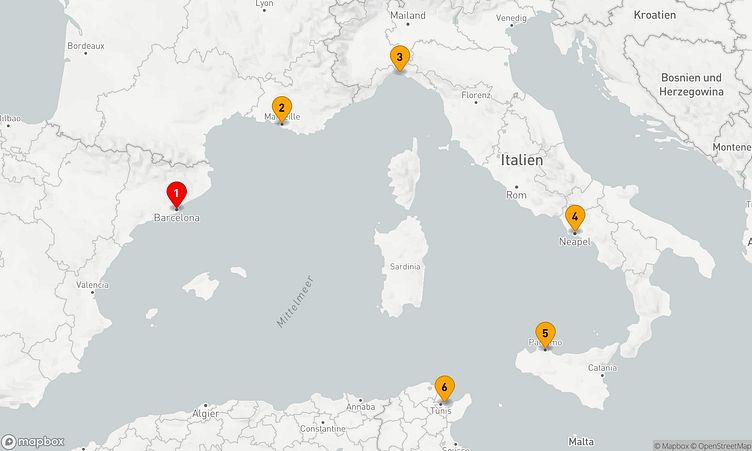 Auf Ihrer Reise besuchen Sie unter anderem die Häfen von Barcelona, Marseille und Neapel, wo spannende Eindrücke von Land und Kultur auf Sie warten.