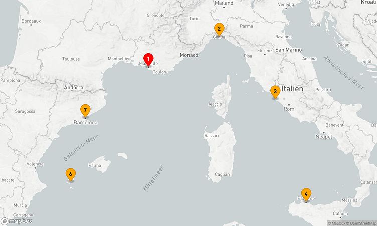 Auf Ihrer Reise besuchen Sie unter anderem die Häfen von Marseille, Genua und Palermo, wo spannende Eindrücke von Land und Kultur auf Sie warten.