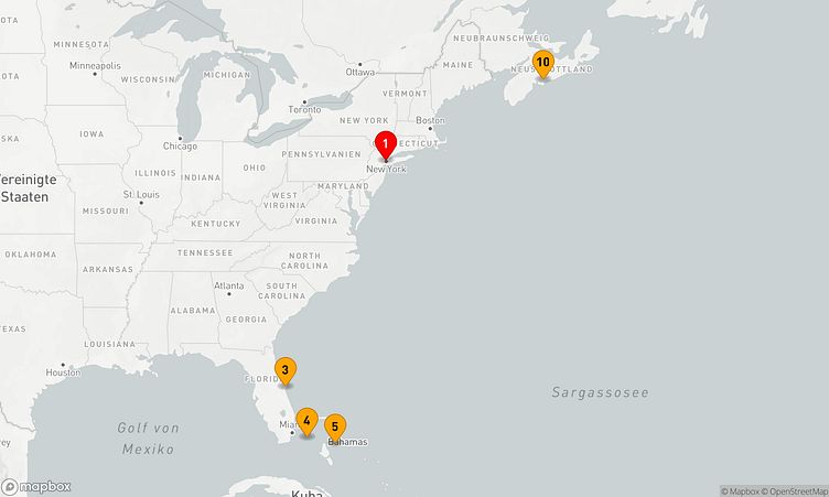 Ihre Route führt Sie unter anderem zu den faszinierenden Häfen von New York City, Port Canaveral und Nassau, wo Sie die Atmosphäre und das Leben vor Ort spüren können.