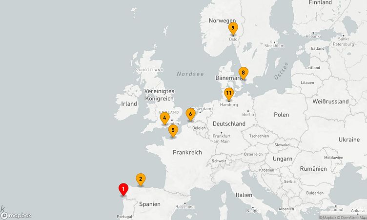Ihre Route führt Sie zu den beeindruckenden Häfen von Vigo, Gijón und Le Havre (Paris), wo Sie die lokale Atmosphäre und das lebendige Treiben vor Ort hautnah erleben können.