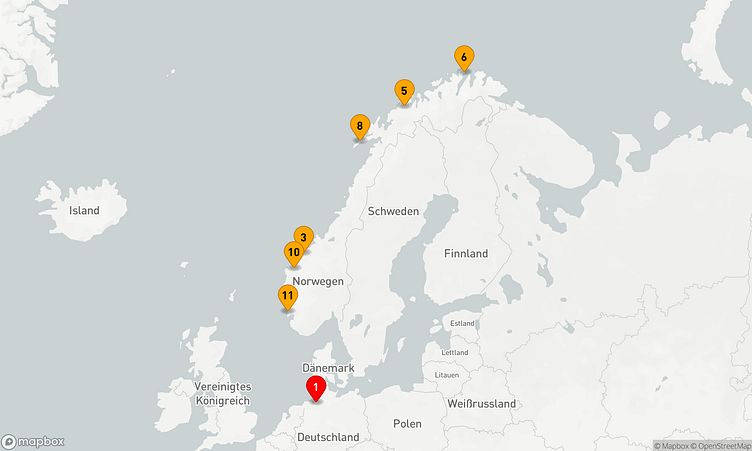 Während der Reise besuchen Sie unter anderem die Häfen von Bremerhaven, Molde und Honningsvåg, die Ihnen spannende Eindrücke und einzigartige Entdeckungen bieten.