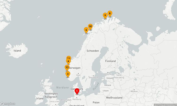 Von Kiel (Deutschland) aus brechen Sie am 16. August 2026 auf, um nach 14 Tagen den Zielhafen Kiel (Deutschland) zu erreichen, wo Ihre Reise endet.