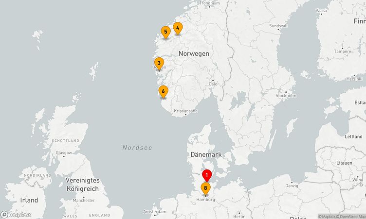 Ihre Route führt Sie unter anderem zu den beeindruckenden Häfen von Kiel, Oslofjord und Kristiansand, wo Sie die lokale Atmosphäre und das lebendige Treiben erleben können.