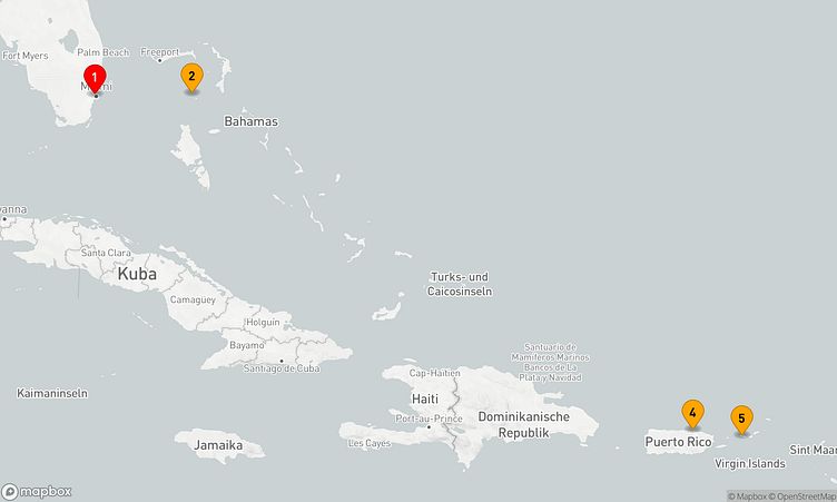 Auf Ihrer Route legen Sie unter anderem in den Häfen von Miami, Coco Cay und San Juan an, um die jeweiligen Highlights und Besonderheiten vor Ort zu entdecken.
