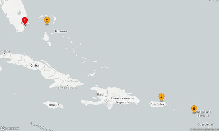 Ihre Route führt Sie unter anderem zu den faszinierenden Häfen von Miami, Coco Cay und Basseterre, wo Sie die Atmosphäre und das Leben vor Ort spüren können.