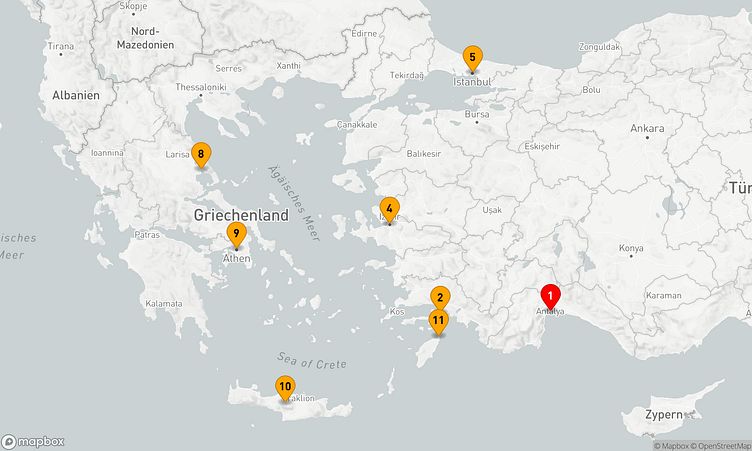 Ihre Kreuzfahrt startet am 11. Oktober 2026 in Antalya (Türkei), und nach 11 Tagen endet sie am 22. Oktober 2026 in Antalya (Türkei).