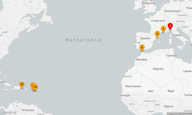 Sie Starten Ihre 16-tägige Reise am 31. Oktober 2026 in Genua (Italien) und erreichen den Zielhafen La Romana (Dominikanische Republik) am 16. November 2026.