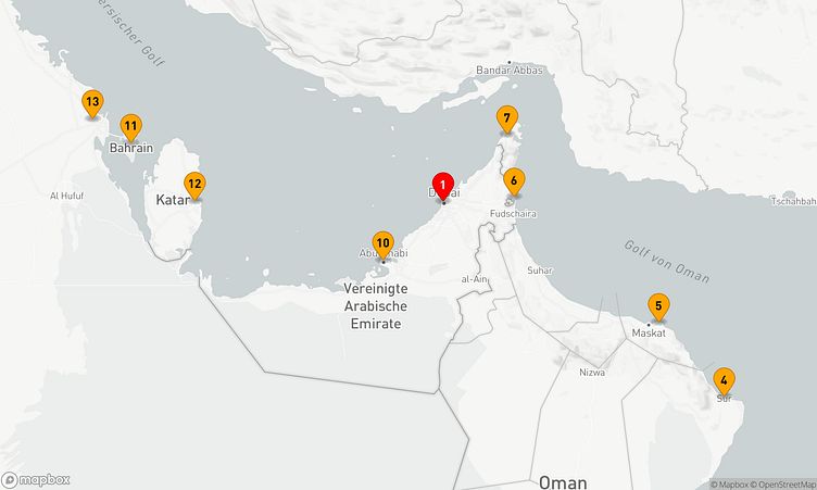 Ihre Route führt Sie unter anderem zu den faszinierenden Häfen von Dubai, Maskat und Dubai, wo Sie die Atmosphäre und das Leben vor Ort spüren können.