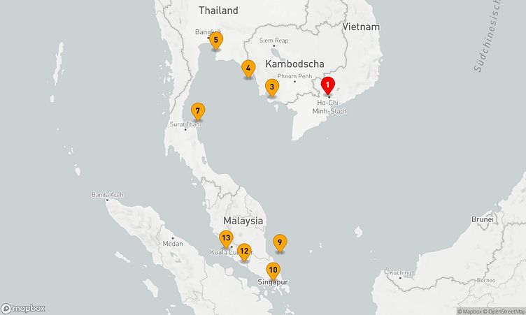 Auf der Route begegnen Sie unter anderem den Häfen von Ho-Chi-Minh-Stadt, Amphoe Ko Kut und Ko Samui, um das besondere Flair und die Einzigartigkeit der Region zu entdecken.