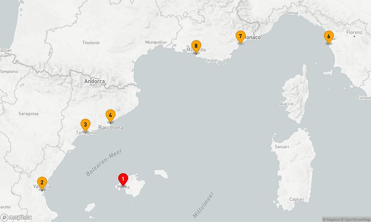 Während der Route halten Sie unter anderem in den Häfen von Palma de Mallorca, Valencia und Barcelona, um in das Flair und die Besonderheiten der Umgebung einzutauchen.
