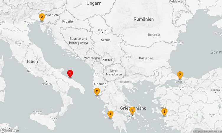 An Häfen wie Bari, Triest und Athen (Piräus) haben Sie die Gelegenheit, die Region auf eine besondere Weise kennenzulernen und Neues zu entdecken.
