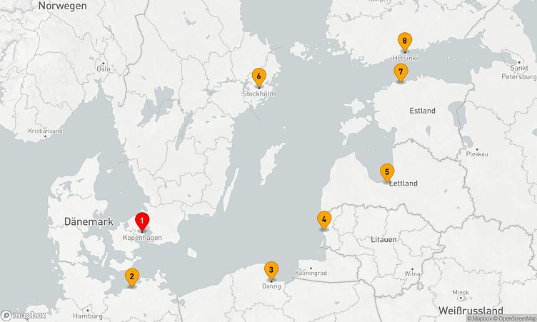 Während der Route halten Sie unter anderem in den Häfen von Kopenhagen, Warnemünde und Klaipeda, um in das Flair und die Besonderheiten der Umgebung einzutauchen.