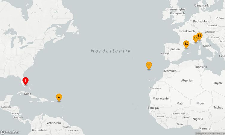 Nach Ihrem Start am 19. April 2026 in Miami (Vereinigte Staaten) führt Sie die Route über 15 Tage bis zu Ihrem Zielhafen Genua (Italien), wo Sie am 04. Mai 2026 ankommen.