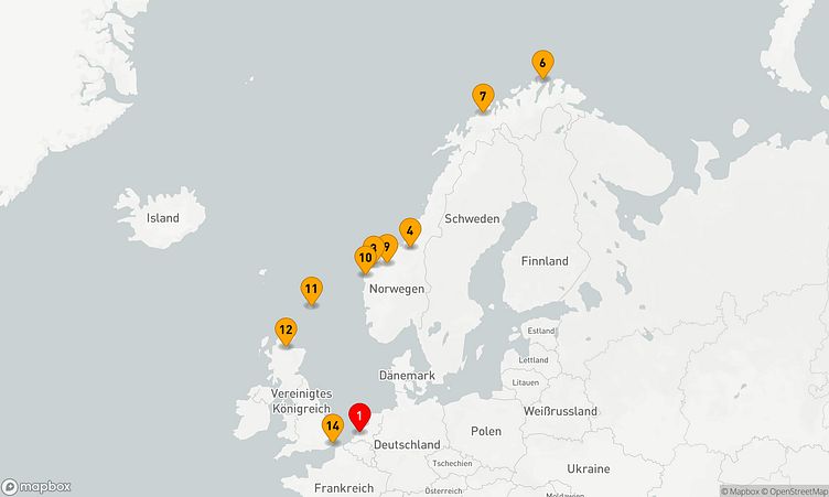 Ihre Route führt Sie unter anderem zu den faszinierenden Häfen von Rotterdam, Trondheim und Åndalsnes, wo Sie die Atmosphäre und das Leben vor Ort spüren können.