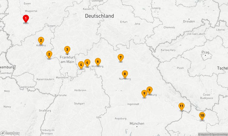 Die Reiseroute startet am 07. November 2026 in Köln (Deutschland) und führt Sie vom 07. November 2026 bis zum 17. November 2026 (10 Tage) nach Passau (Deutschland).