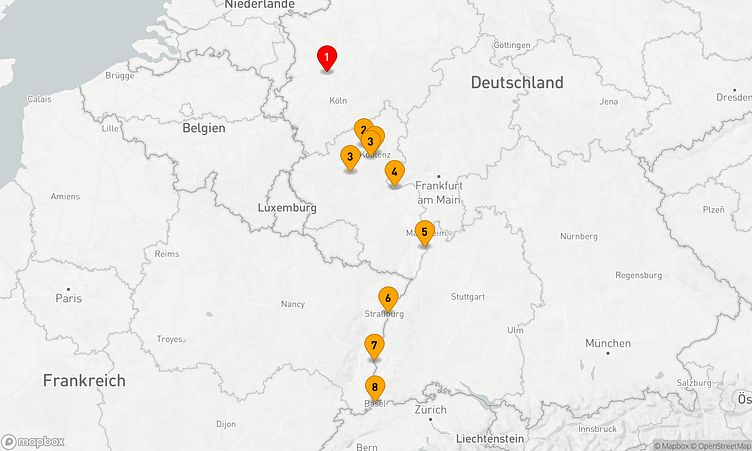 Startpunkt ist Düsseldorf (Deutschland), von wo aus Sie am 20. Dezember 2027 aufbrechen und nach 7 Tagen den Zielhafen Basel (Schweiz) erreichen, wo Ihre Reise ihren Abschluss findet.