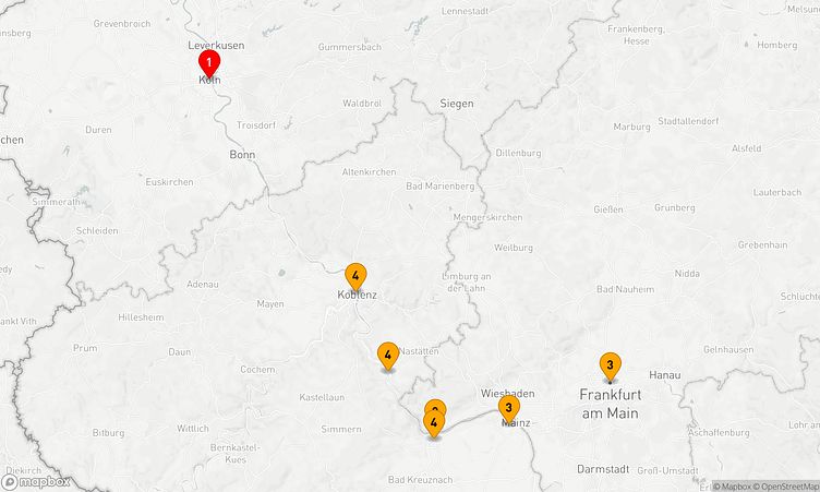 Ihre Route führt Sie zu den beeindruckenden Häfen von Köln, Rüdesheim am Rhein und Mainz, die mit einzigartigen Sehenswürdigkeiten und lebendigen Eindrücken auf Sie warten.