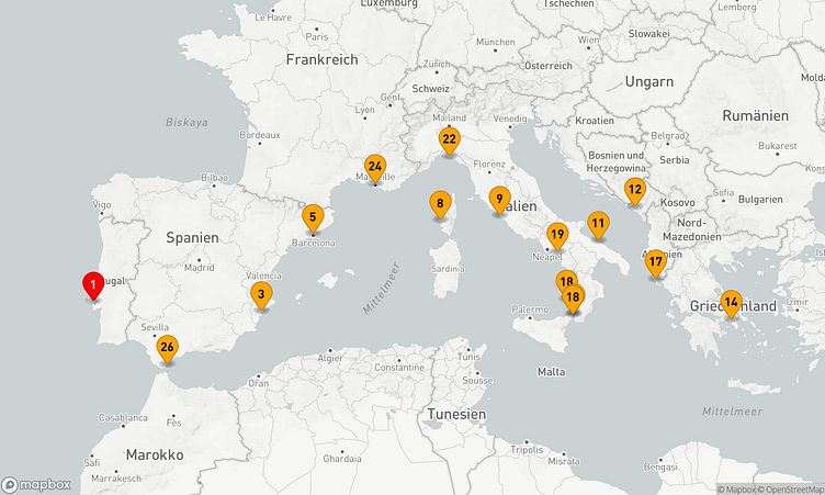 Während Ihrer Reise besuchen Sie unter anderem die Häfen von Lissabon, Ajaccio (Korsika) und Athen (Piräus), die Ihnen faszinierende Eindrücke und einzigartige Erlebnisse ermöglichen.