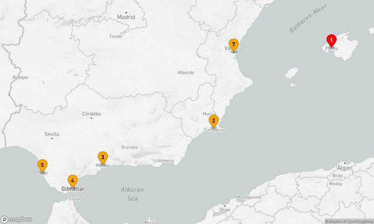 Während der Route halten Sie unter anderem in den Häfen von Palma de Mallorca, Cartagena (ES) und Malaga, um in das Flair und die Besonderheiten der Umgebung einzutauchen.