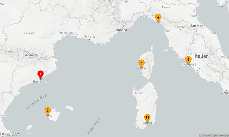 Während dieser Reise machen Sie Halt in den Häfen von Barcelona, La Spezia und Palma de Mallorca, wo Sie lokale Highlights entdecken und unvergessliche Eindrücke sammeln können.