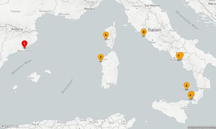 An Häfen wie Barcelona, Alghero und in der Straße von Messina haben Sie die Möglichkeit, die Region auf eine besondere Art zu erkunden und neue Eindrücke zu sammeln.