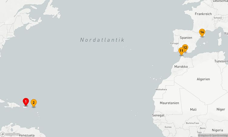 Sie starten Ihre 13-tägige Reise am 03. April 2027 in San Juan (Puerto Rico) und erreichen den Zielhafen Barcelona (Spanien) am 16. April 2027.