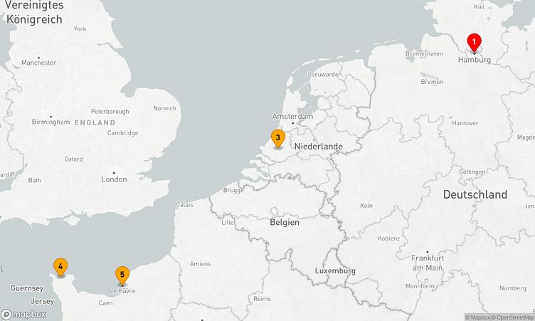 Die Reiseroute beginnt am 18. Oktober 2026 in Hamburg (Deutschland) und führt sie vom 18. Oktober 2026 bis zum 22. Oktober 2026 (4 Tage) nach Le Havre (Paris) (Frankreich).