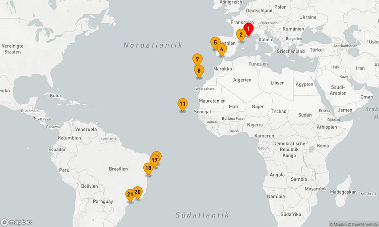 Am 03. November 2025 beginnt Ihre Reise in Marseille (Frankreich), und nach 20 Tagen erreichen Sie am 23. November 2025 den Hafen von Santos (Brasilien).