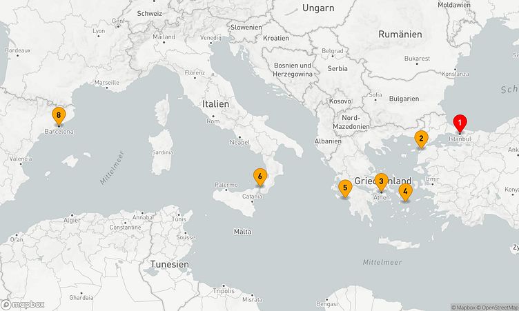 Während der Route halten Sie unter anderem in den Häfen von Istanbul, Dardanellen (Passage) und Mykonos, um in das Flair und die Besonderheiten der Umgebung einzutauchen.