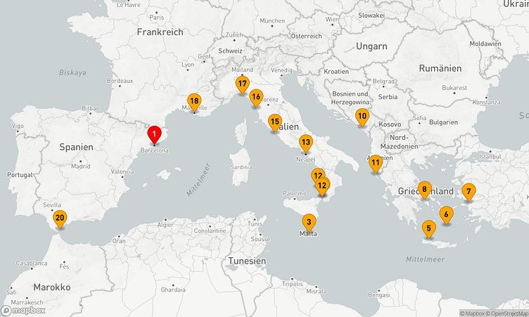 Während der Fahrt besuchen Sie unter anderem die Häfen von Barcelona, Kusadasi und die Straße von Messina, die Ihnen spannende Eindrücke und einzigartige Entdeckungen bieten.
