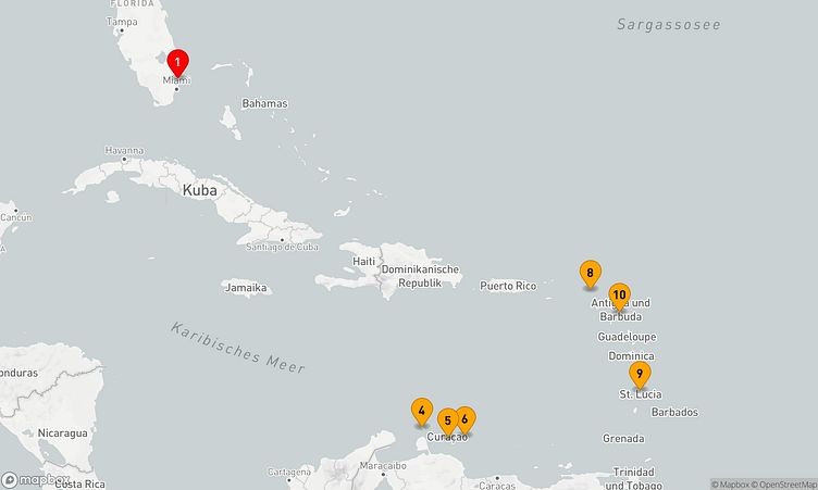 Ihre Route führt Sie zu faszinierenden Häfen wie Fort Lauderdale, Oranjestad und Bonaire, wo Sie die lokale Atmosphäre und das Leben vor Ort hautnah erleben können.