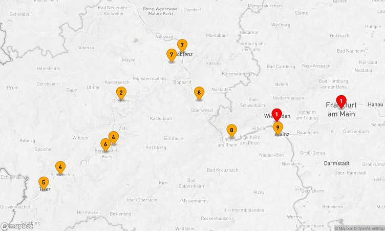 Freuen Sie sich auf Anläufe in Häfen wie Frankfurt am Main, Schweich und Bernkastel-Kues, die Ihnen authentische Einblicke und besondere Erlebnisse bieten.