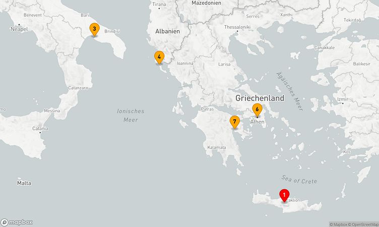 Die Reiseroute beginnt am 01. Mai 2026 in Heraklion (Griechenland) und führt Sie vom 01. Mai 2026 bis zum 08. Mai 2026 (7 Tage) nach Heraklion (Griechenland).