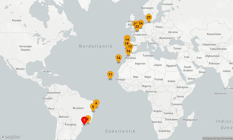 Die Reiseroute beginnt am 19. April 2026 in Santos (Brasilien) und führt Sie vom 19. April 2026 bis zum 15. Mai 2026 (26 Tage) nach Kiel (Deutschland).