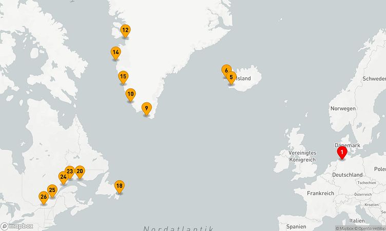 Start ist am 23. August 2027 in Bremerhaven (Deutschland). Über eine Dauer von 25 Tagen gelangen Sie schließlich nach Montreal (Kanada), wo Sie am 17. September 2027 ankommen.
