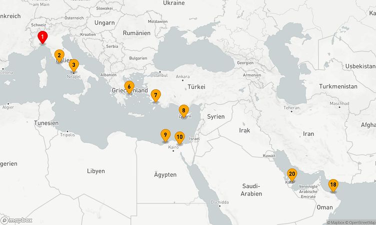 Ihre Reise beginnt am 20. November 2027 in Genua (Italien), und nach 19 Tagen, am 09. Dezember 2027, erreichen Sie den Hafen von Doha (Katar).