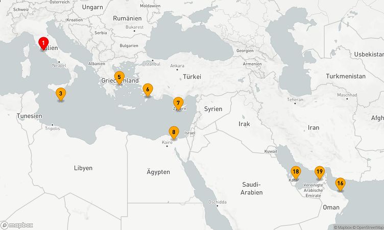 Während der Route halten Sie unter anderem in den Häfen von Rom / Civitavecchia, Athen (Piräus) und Suezkanal, um in das Flair und die Besonderheiten der Umgebung einzutauchen.