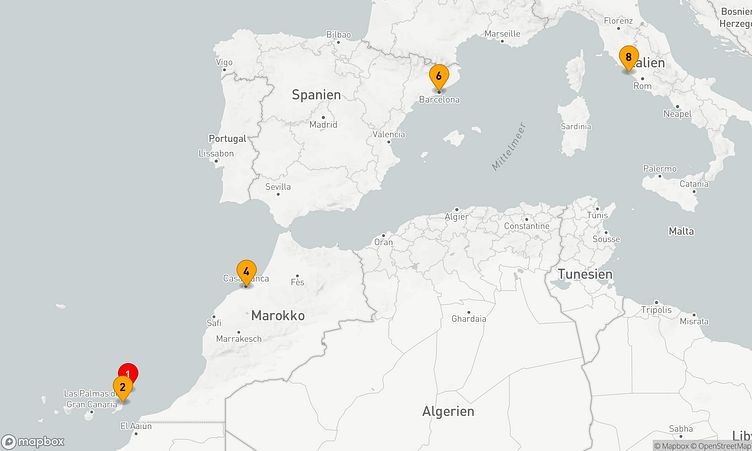 Während der Reise besuchen Sie unter anderem die Häfen von Arrecife / Lanzarote, Fuerteventura und Barcelona, die Ihnen spannende Eindrücke und einzigartige Entdeckungen bieten.
