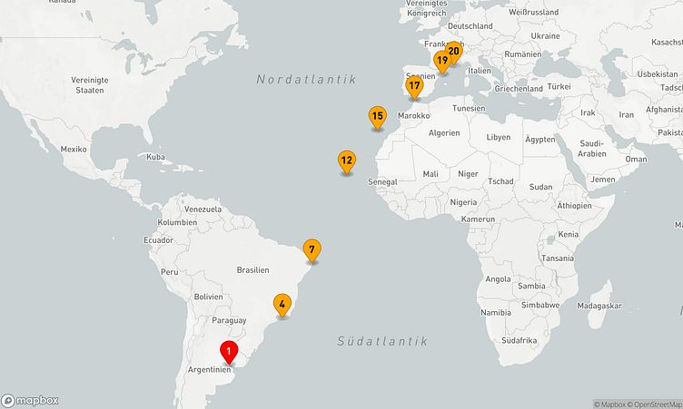 Die Reiseroute beginnt am 13. März 2026 in Buenos Aires (Argentinien) und führt Sie vom 13. März 2026 bis zum 01. April 2026 (19 Tage) nach Marseille (Frankreich).