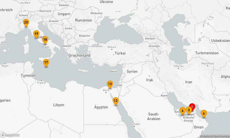 Nach Ihrem Start am 03. April 2027 in Dubai (Vereinigte Arabische Emirate) führt Sie die Route über 19 Tage bis zu Ihrem Zielhafen Genua (Italien), wo Sie am 22. April 2027 ankommen.
