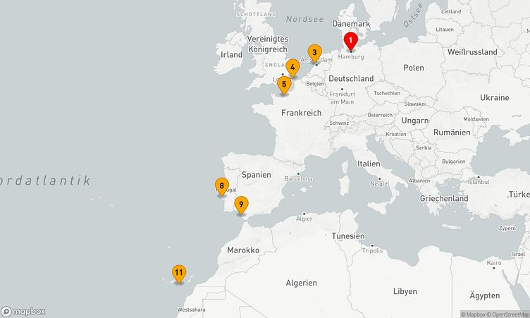 Die Reise beginnt am 08. November 2026 in Hamburg (Deutschland) und führt Sie vom 08. November 2026 bis zum 18. November 2026 (10 Tage) nach Gran Canaria (Spanien).
