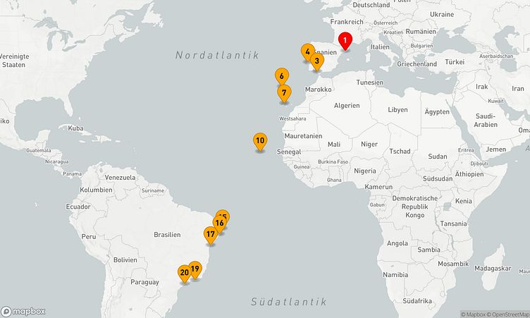 Am 04. November 2025 beginnt Ihre Reise in Barcelona (Spanien), und nach 19 Tagen erreichen Sie am 23. November 2025 den Hafen von Santos (Brasilien).