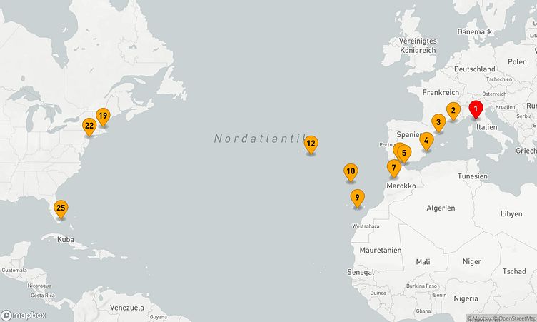 Ihre Reise beginnt am 18. Oktober 2026 in Livorno (Italien) und endet nach 24 Tagen am 11. November 2026 im Hafen von Miami (Vereinigte Staaten).