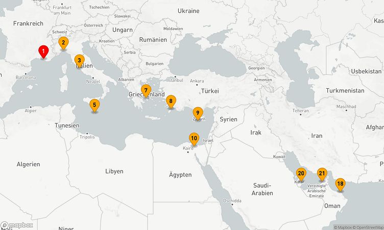 Die Reiseroute beginnt am 07. November 2026 in Marseille (Frankreich) und führt Sie vom 07. November 2026 bis zum 28. November 2026 (21 Tage) nach Dubai (Vereinigte Arabische Emirate).