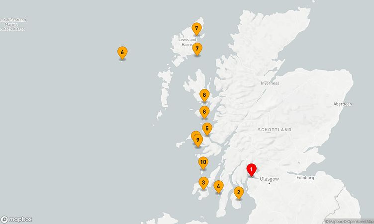 Ihre Route führt Sie zu beeindruckenden Häfen wie Glasgow (Greenock), - und St. Kilda, wo Sie die lokale Atmosphäre und das Leben vor Ort hautnah erleben können.