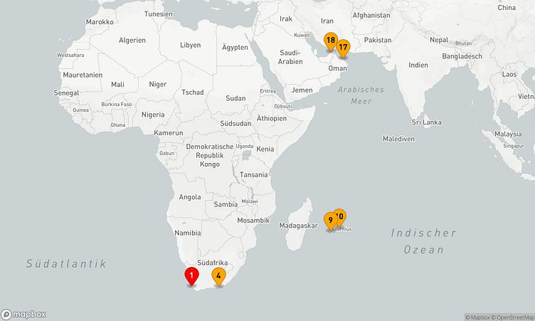 Während dieser Reise machen Sie Halt in den Häfen von Kapstadt, Port Elizabeth und Maskat, wo Sie die lokalen Sehenswürdigkeiten erkunden und unvergessliche Eindrücke sammeln können.